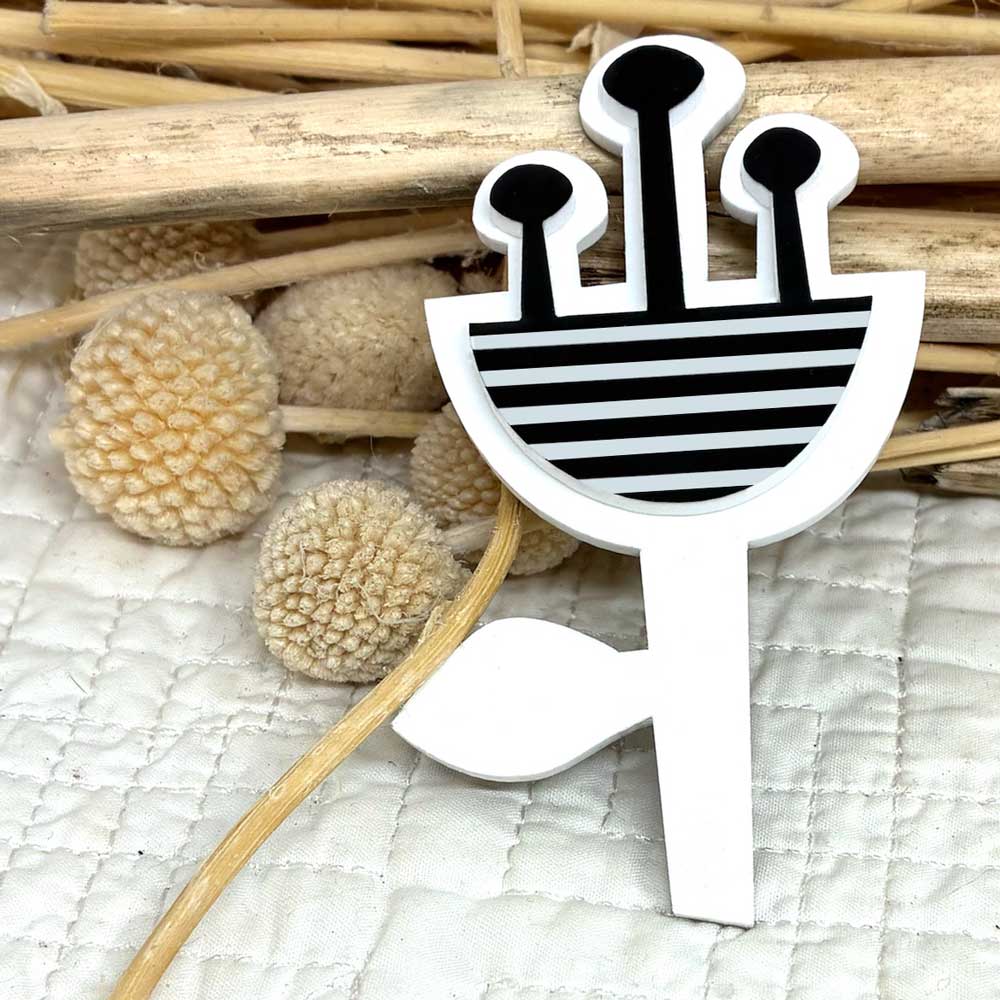 Flower on Stem Brooch - White with  Black and White Striped