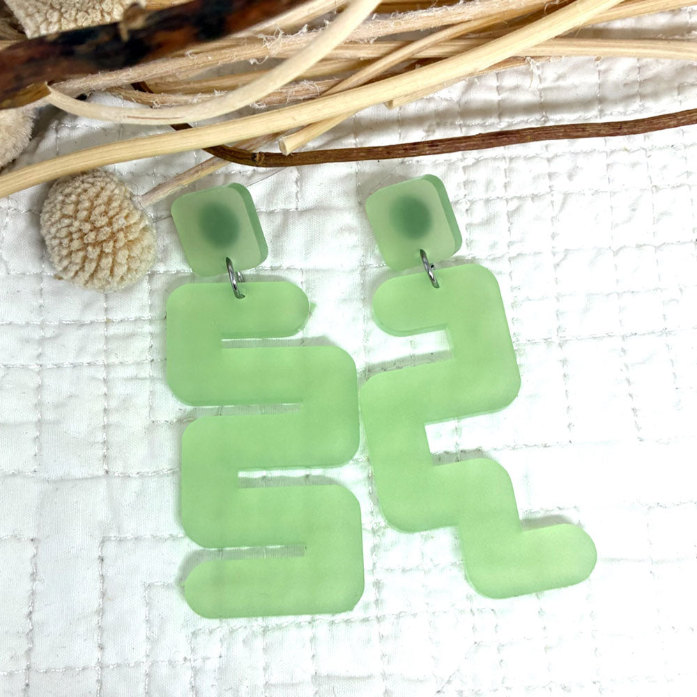 Statement earrings in a frosted pale green (translucent). Each earring is a different design for an interesting unexpected twist... defying ordinary. Very stylish and simple that you will love wearing. Only one pair made in this colour.