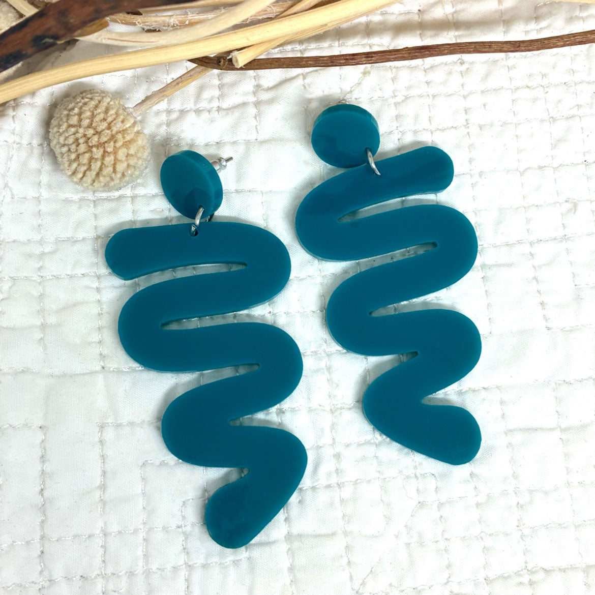 Fabulous organic snake earrings in a teal. So stylish and simple that you will love wearing. Only one pair made in this colour.